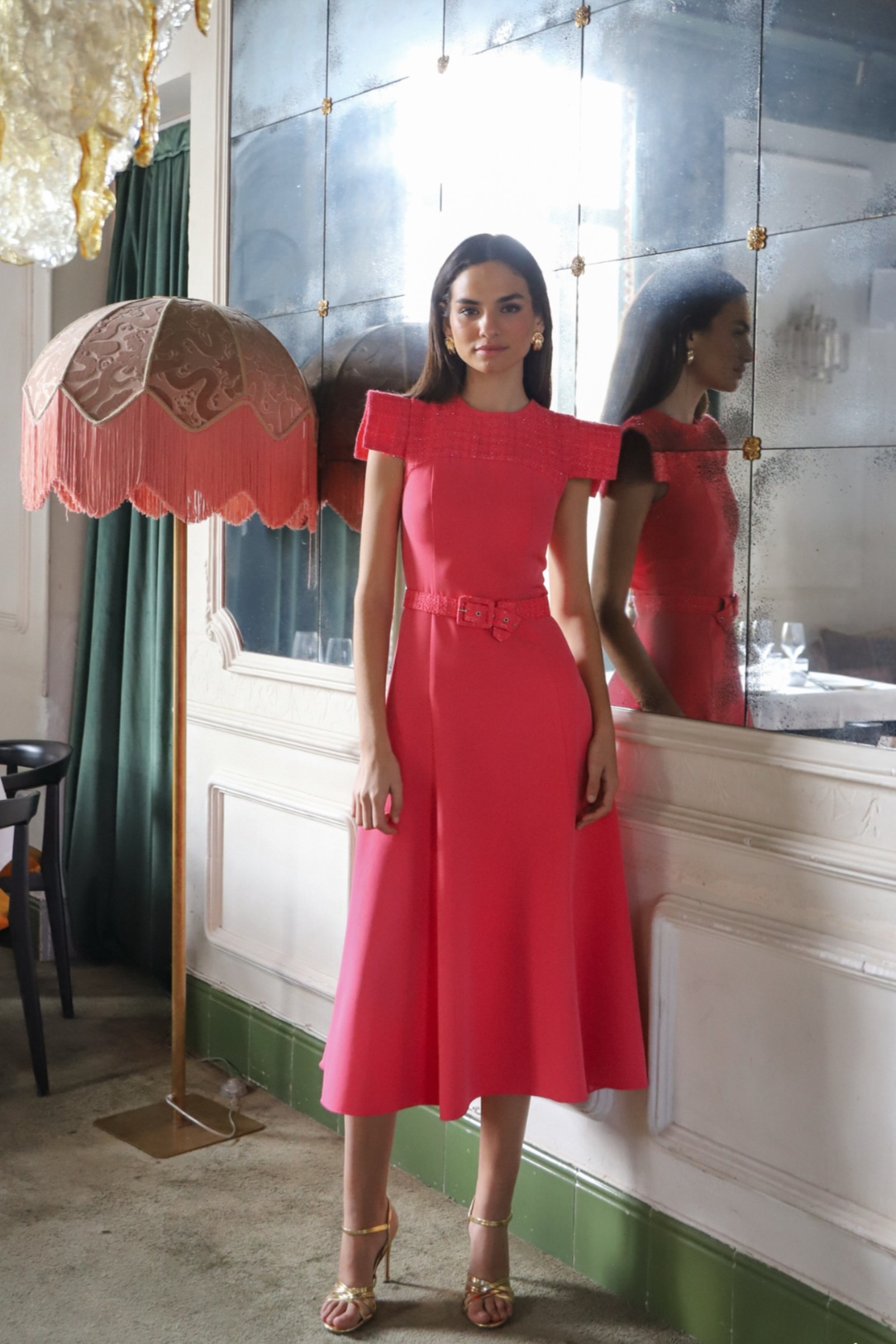 Este vestido de corte midi, falda de vuelo y estilo chanel, es una pieza estrella de la colección con el que no pasarás desapercibida. En color rosa fucxia, con detalle de cinturón y hombreras en mangas.
